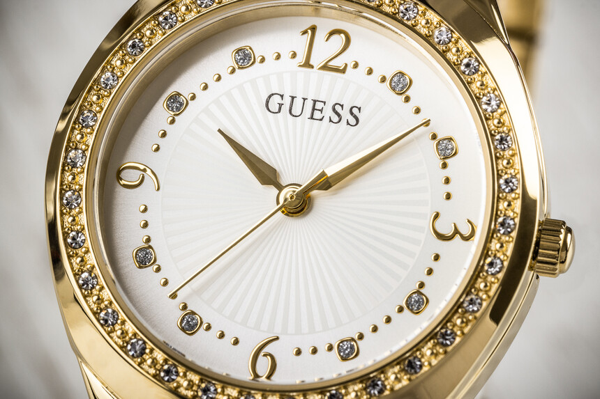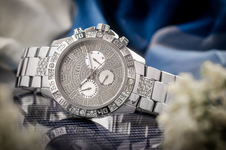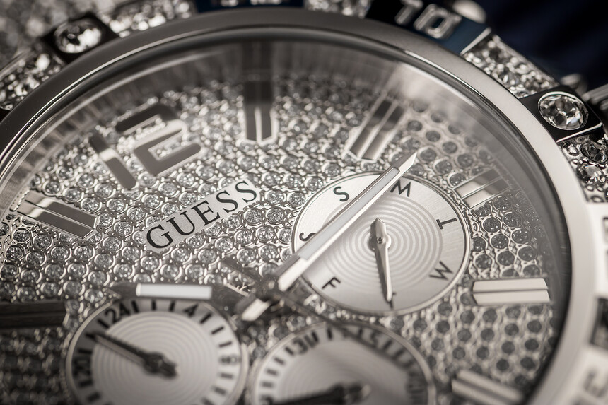 Neben der Größe glänzt die Uhr mit zahllosen funkelnden Steinchen – daran hat Guess nie gespart.
