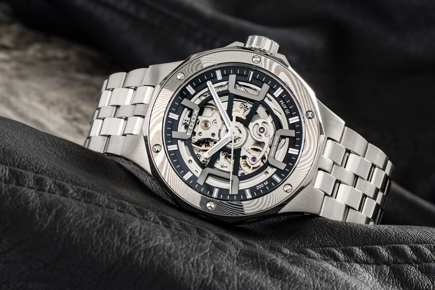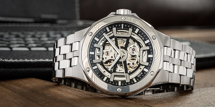 Schon aus den Produktfotos (oder dem Namen) geht hervor, dass die Uhr Damaststahl verwendet. Zwar nicht für das gesamte Gehäuse, aber als Lünetteneinlage – mit ausreichend großer Wirkung.