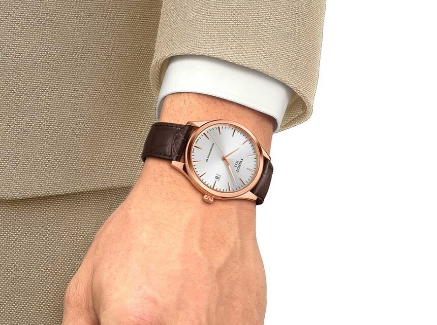 Die Classic Dream haben nun zeitgemäße 40 mm Durchmesser, was zum eleganten, dressigen Design deutlich besser passt als 42 mm. Am Handgelenk wirkt das Modell ausgewogen – wohl dank stimmiger Proportionen und gelungener Konstruktion (die Höhe liegt bei lediglich 10,23 mm). Tissot lässt dem schlichten Sunburst‑Zifferblatt zudem viel Raum zum Atmen, und die Lünette besteht nur aus einem schmalen Edelstahlring.