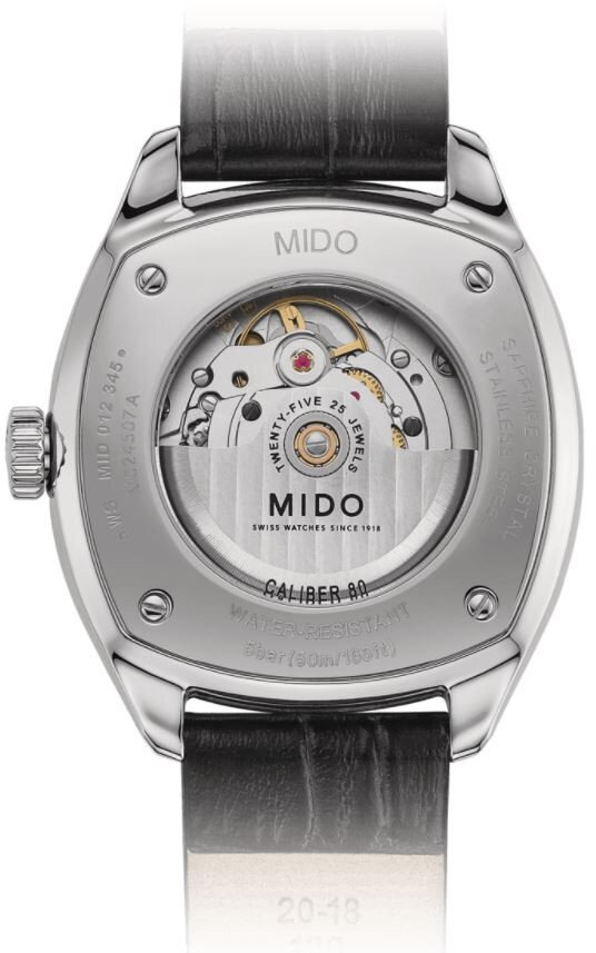 Mechanisch mit automatischem Aufzug. Mido Caliber 80 gebaut auf ETA C07.621 gebaut auf ETA 2836-2 gebaut auf ETA 2824-2, Gangreserve 80h, 21.600 BPH (3Hz), 25 Steine