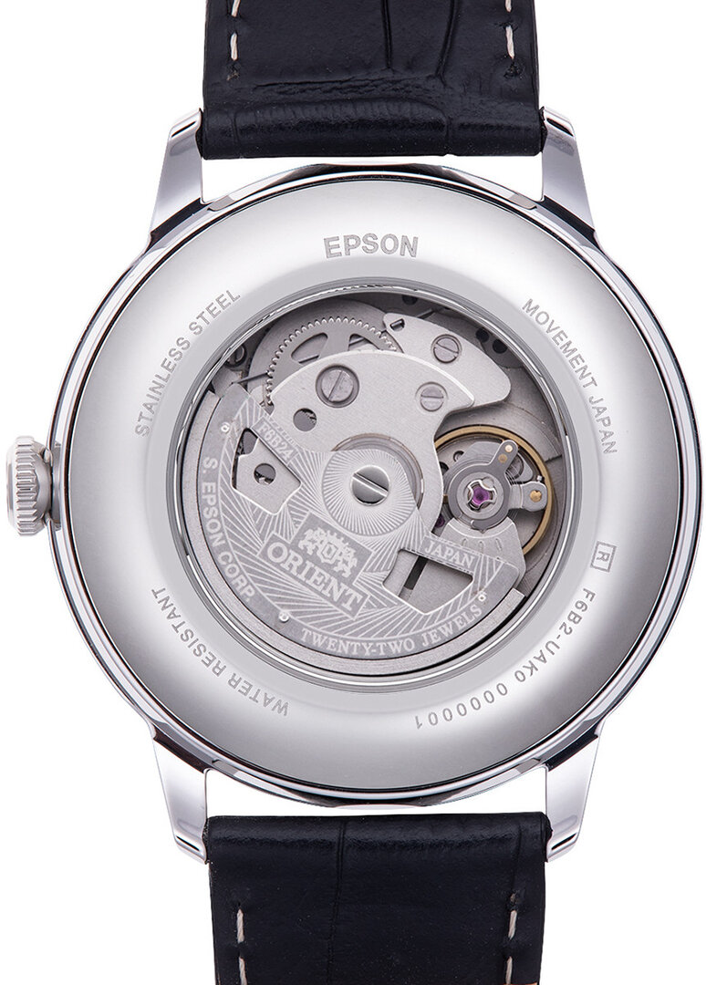 Mechanisch mit automatischem Aufzug. Orient F6B24, Gangreserve 40h, 21.600 BPH (3Hz), 22 Steine, Hacking, Möglichkeit des Handaufzugs, Reversible Aufzug